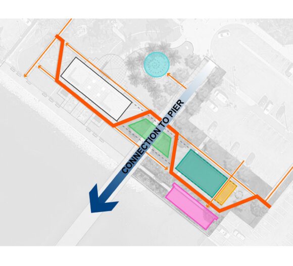 The design prioritizes a strong connection to the pier, which also serves as the park’s primary axis linking existing parking areas — visitors’ primary mode of access to the park — to the waterfront. Marked by gateway signage a serpentine path links users to a new splashpad, an existing concession building, and the pier itself. A new lawn area serves as the community yard and provides space for picnics or play, and is flanked by a small covered plaza for shade, and gazebo-like garden room.