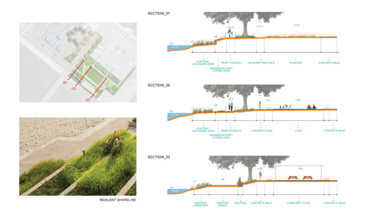 The waterfront experience is further enhanced by a public gathering space perched above the bay. A resilient landscape, including a low, subtidal marsh zone, serves as a natural barrier between the water and the new perch that’s integrated with an existing concrete seawall.